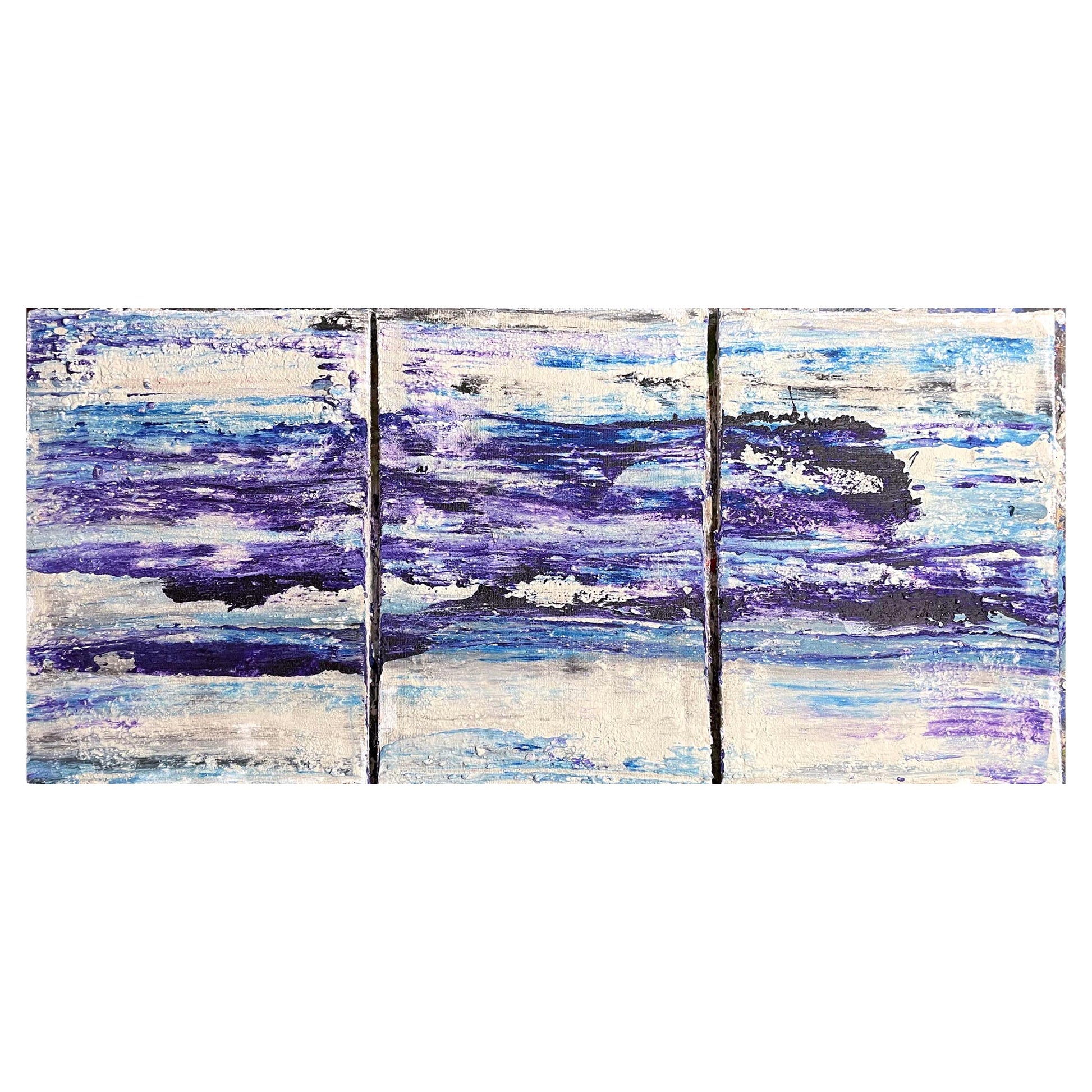 AB#330 Oceano is a triptych that captures the power of the sea through dark waves and very textured white lines, made with putty and glue.The blue, in its darkest hues, recalls the force of the undertow, while the waves, developing from the bottom upwards, convey a sense of continuous and dynamic movement. The work invites us to reflect on the intensity and beauty of an unstoppable flow, which develops without end and without certainty.