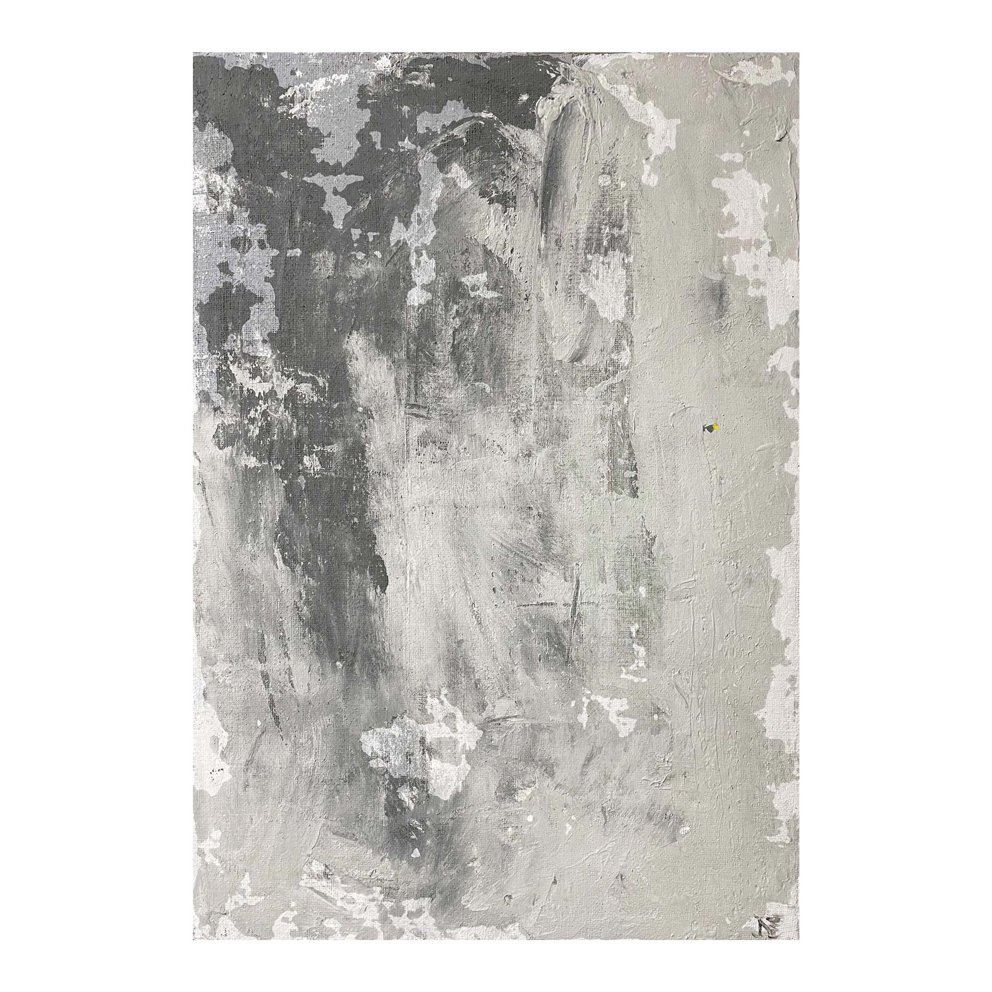 AB#324 Cemento II explores the concept of grey as a lunar terrain, with a play of nuances between light and dark greys that evoke a dry and mysterious surface.Curiosity is aroused by a tiny spot of primary yellow, symbolising the sun, which stands out on the canvas, interrupting the unity of an otherwise monochromatic landscape.The work invites us to reflect on solitude and the intensity of visual perception, with a strong contrast between darkness and light, representing a kind of emotional and spatial exploration.
