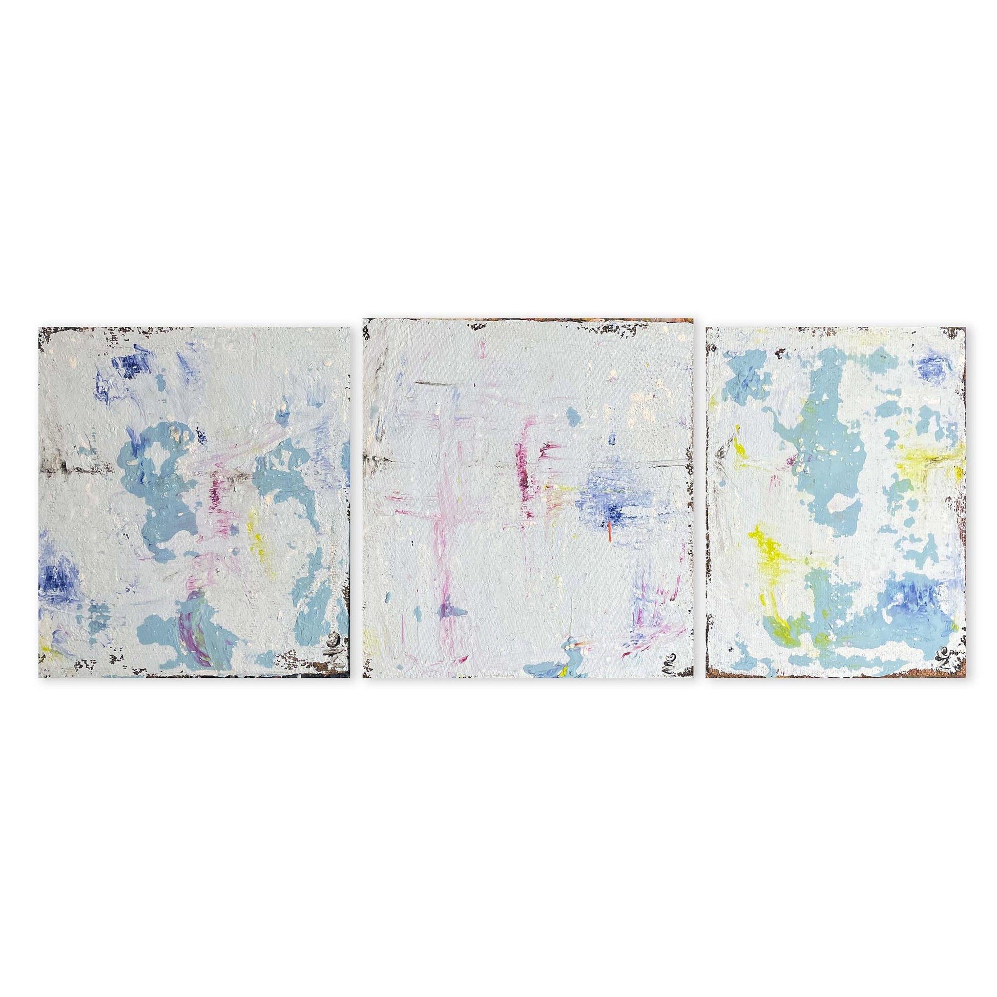 AB#321 Sosta al tramonto is a triptych that plays with uneven and rough canvas, where colour becomes a unifying element. The light blue, almost white, creates a soft expanse stretching across the canvas, with subtle hints of red, yellow and patches of dark blue.The work represents the act of stopping during movement, capturing the moment of the slowly fading sunset.The delicacy of the colours and the nuances offer a reflection on the passing of time and the beauty of a fading moment, inviting the viewer to stop and observe the ephemeral beauty of a disappearing sunset.