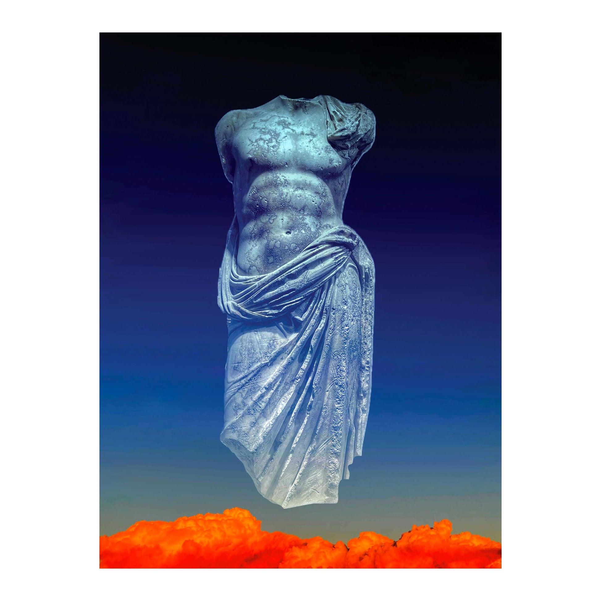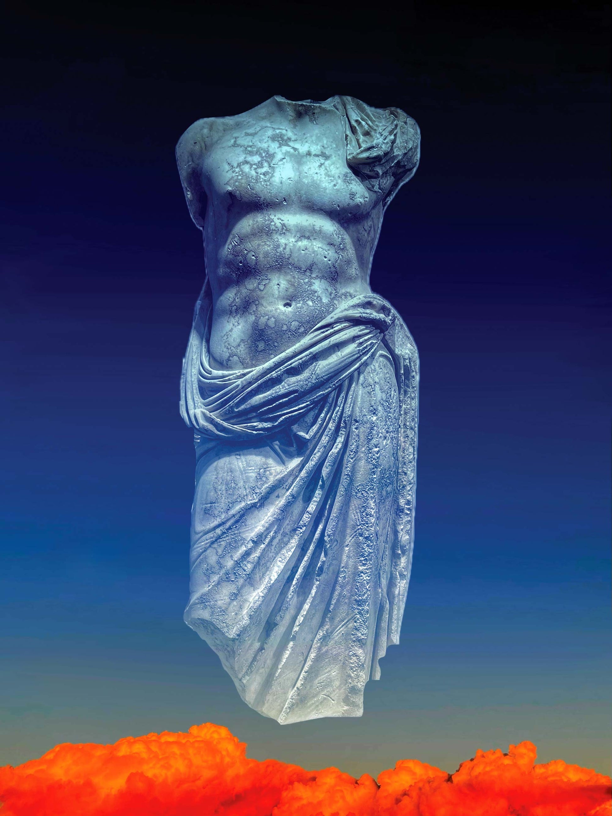 ABC#132 Universo is the work with which the artist won the 61st Silver Thistle. It depicts a sculptural bust, probably of Apollo, photographed in the archaeological museum of Kos. The work is a photomontage, where the marble bust, with an opaque rendering, is set against a blue background, with bright orange clouds below to create a contrast between complementary colours. The narrative explores how the beauty of the classical Greek and Roman eras, although not always physically present, continues to influence contemporary aesthetics, as a timeless beauty that remains alive in the spirit of humanity.