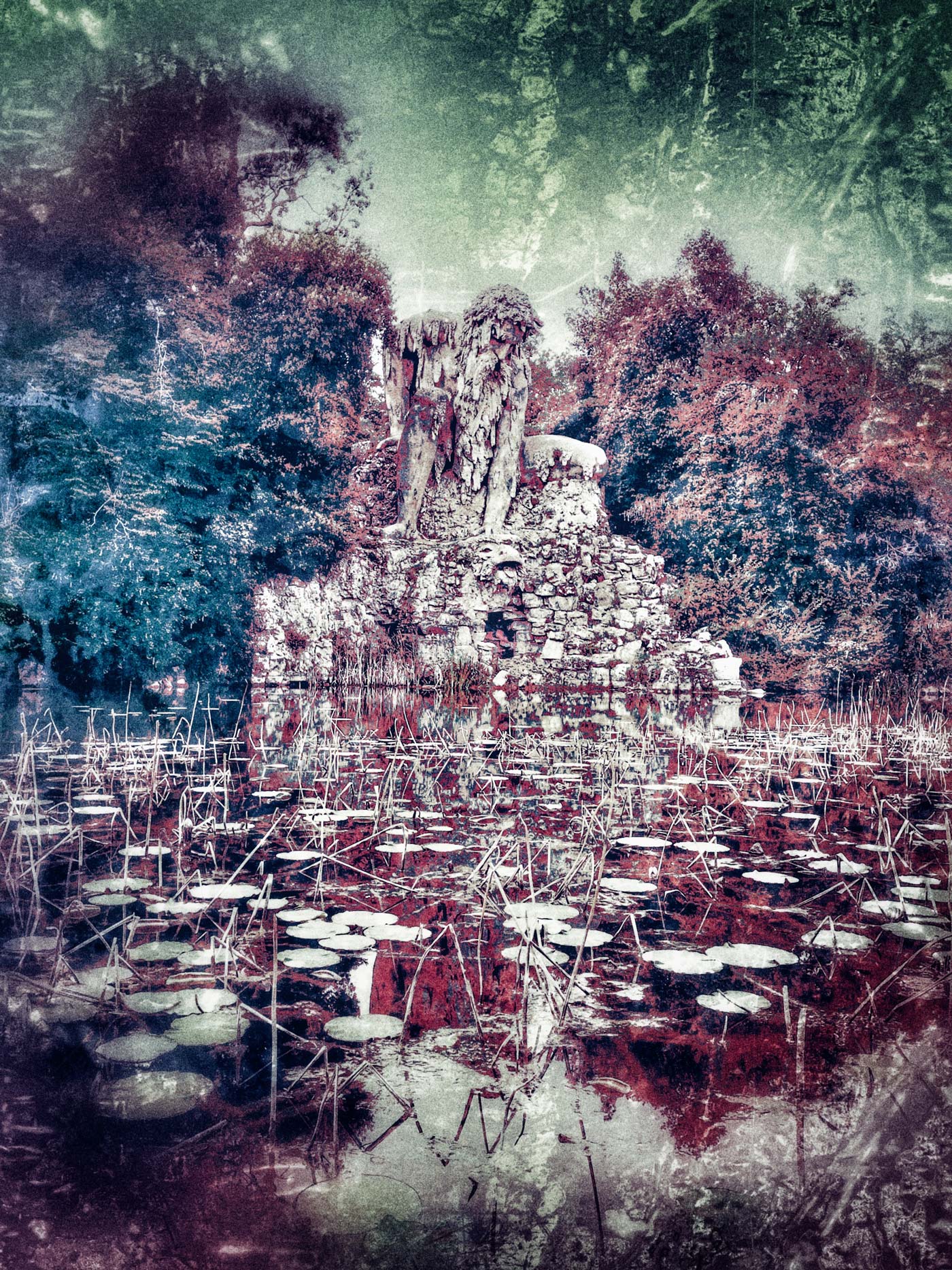 AB#81-34 The Giant is an abstract photograph taken at Villa Demidoff, with Giambologna's Apennine landscape in the background, taken through the fountain. The image has been transformed through a customised effect created by the artist, giving it an abstract quality. Shades of green and red, similar to brushstrokes, blend around the central figure, creating a new view of the landscape and creating a renewed atmosphere that invites the viewer to explore the subject from a new angle.